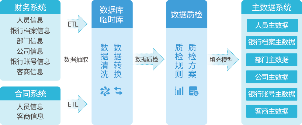 第一时间明确各主数据的数据源头,顺利获得数据库表直连的方式或者接口传输的方式接入业务系统主数据,然后在主数据系统数据集成模块对数据进行清洗、转码,将数据处理成符合规范的数据,填充至各主数据模型。