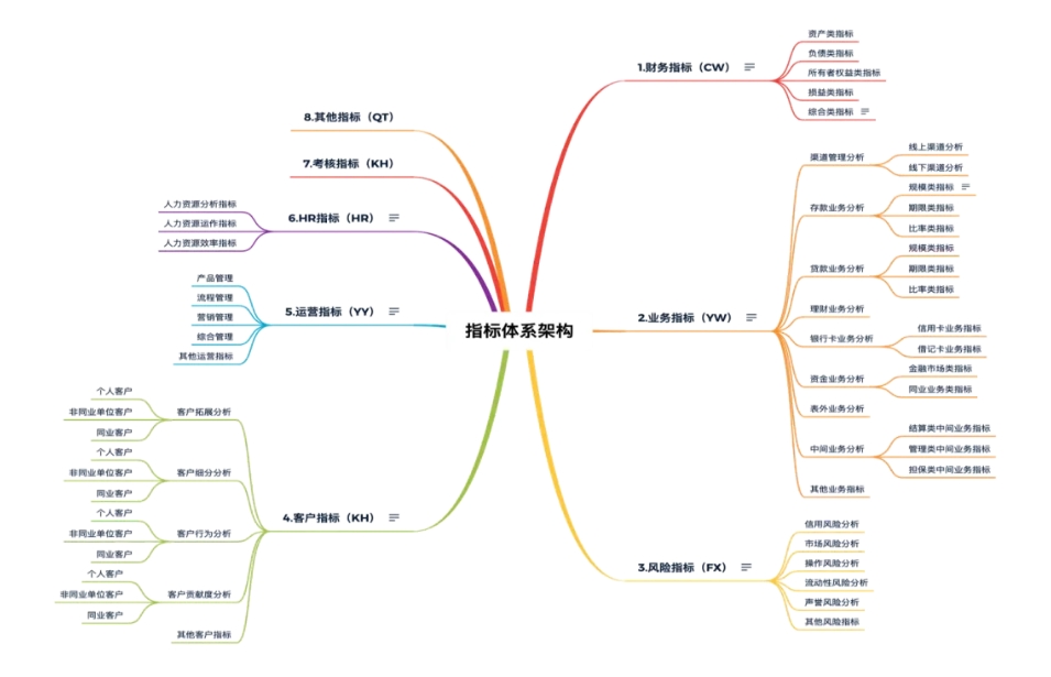 降低内部管理运营成本、提升经营管理效率,是与提升银行收益相辅相成的另一关键性经营管理要素。从财务、运营角度建立银行非监管口指标管理体系,包括8大类一级指标-管理层指标、 33小类二级指标-基础层指标、27小类三级指标-微观层指标,分类设计有效满足经营管控信息全覆盖需求,为精细化管理与考核、业务经营决策给予高效数据支持。