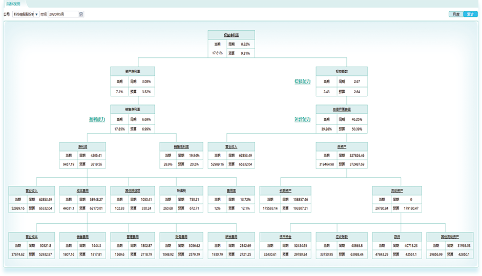 分别从盈利能力、运营能力、偿债能力、成本管理等方面进行数据分析,展现领导关注的核心指标,并可以将异常值进行预警,从而对企业经济效益的优劣作出准确的判断和评价。