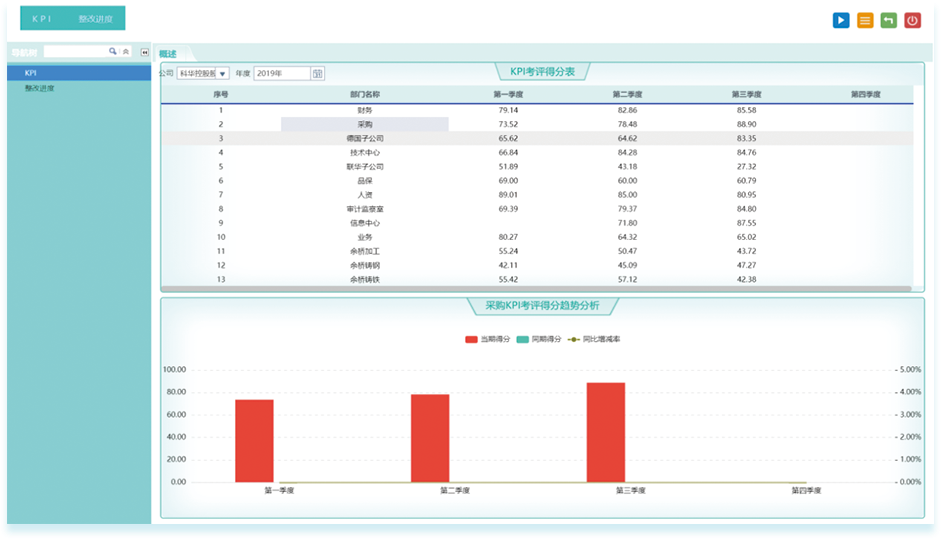 科华控股智能分析平台的建设完成了总经理驾驶舱、KPI管理、财务管理、质量管理和采购管理五大模块的界面,项目工作按照系统设计方案中规定的技术指标和技术参数,根据科华控股有关的要求,完成了系统的建设,为科华控股的公司经营给予了更加便捷有效的管理方式,并实现如下管理目标:
