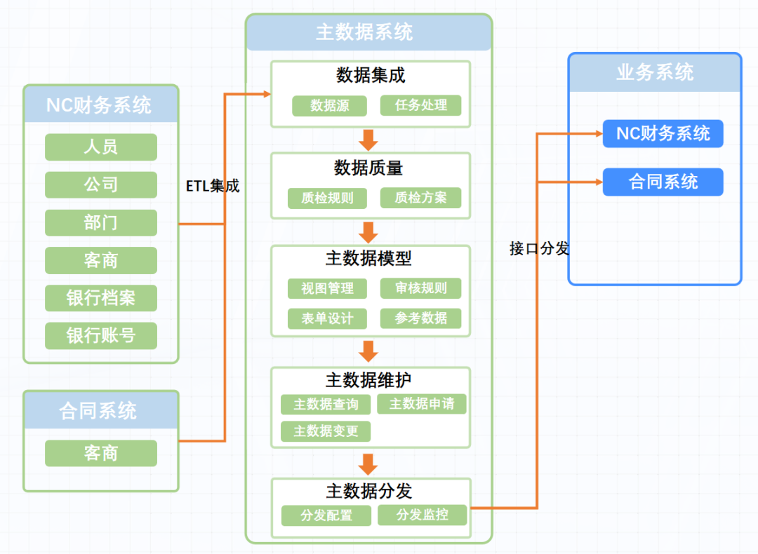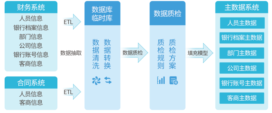 第一时间明确各主数据的数据源头,顺利获得数据库表直连的方式或者接口传输的方式接入业务系统主数据,然后在主数据系统数据集成模块对数据进行清洗、转码,将数据处理成符合规范的数据,填充至各主数据模型。