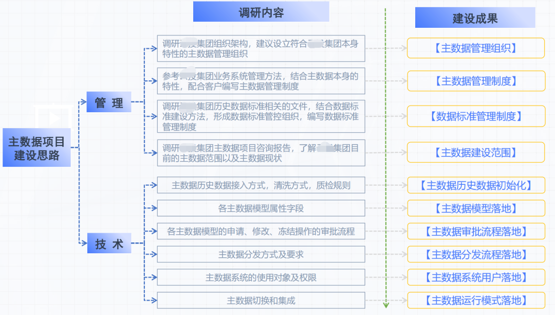 此投资集团企业主数据项目实施,分为咨询规划和实施落地两大部分,包括现状分析评估、体系规划、实施规划、平台搭建与落地。主数据体系建设是企业数据管理的核心,是标准化数据的载体。最终项目顺利获得Ebpay主数据管理软件搭建主数据管理系统进行落地。