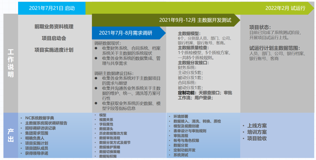 为满足企业业务需要,提高信息化管理水平,特提出从集团总部各主要管理部门开始,以制定主数据标准、建立管理制度和流程、建设主数据管理系统(MDM)为主要目标,实现集团本部合同管理系统、人力资源系统、OA、门户系统、财务系统集群(预算、共享、资金、核算系统)、采购管理平台、档案管理系统的主数据统一管理。