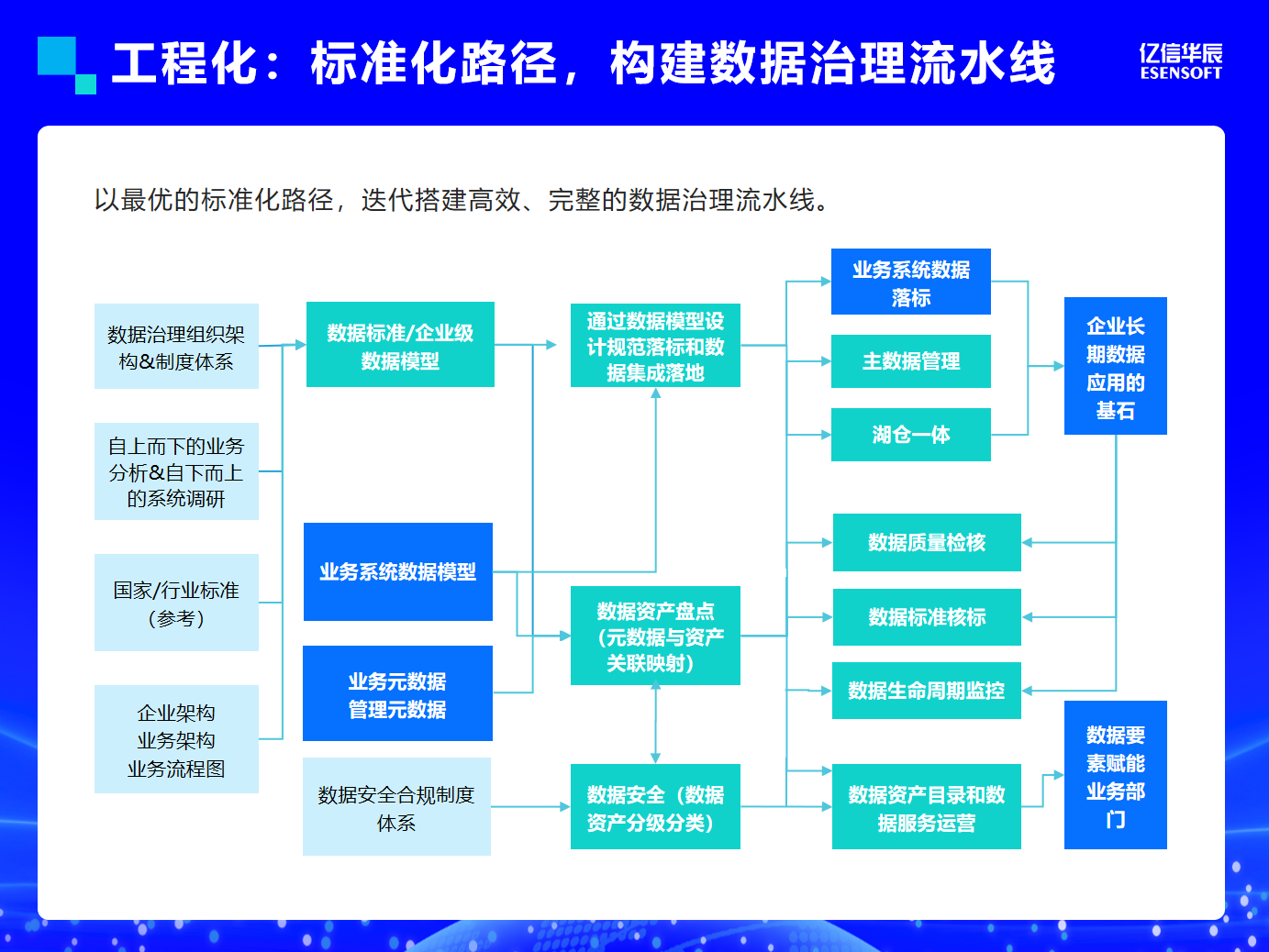 为解决短期VS长期、局部VS全局、效率VS质量等核心矛盾,Ebpay提出数据治理“三化”理念,场景化是数据治理行业痛点的对症处方,工程化是数据治理流水线和标准化,智能化是数据治理自动化和去低端人工化。