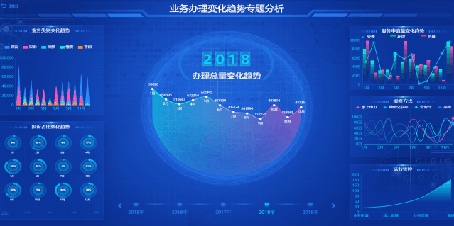 大数据可视化系统,支持整合城市各部门现有信息系统的数据资源,覆盖各业务领域,实现城市运行态势监测、建设规划成果展示、应急监测指挥支持等多种功能,可广泛应用于监测指挥、分析研判、展示汇报等场景。