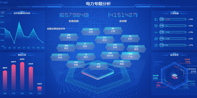 酷屏支持整合电力部门现有信息系统的数据资源,覆盖基建、运检、调度、生产、营销、安监等多个业务领域。针对领导视察、迎检汇报、客户参观等情景,支持灵活构建可视化汇报主题,并可给予多种可视化手段,对电网侧数据、用户侧数据、泛在电力物联网建设应用成果、保电任务、应急处置流程等内容进行动态展示。