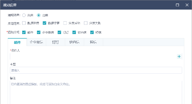 系统内已实现与企业微信、钉钉应用的集成,顺利获得界面化配置即可完成消息通知。顺利获得邮件、企业微信、钉钉、站内信、短信多种方式发送即时消息,帮助相关人员在平台内、外都可以及时分析关注的数据动态及待办事项。