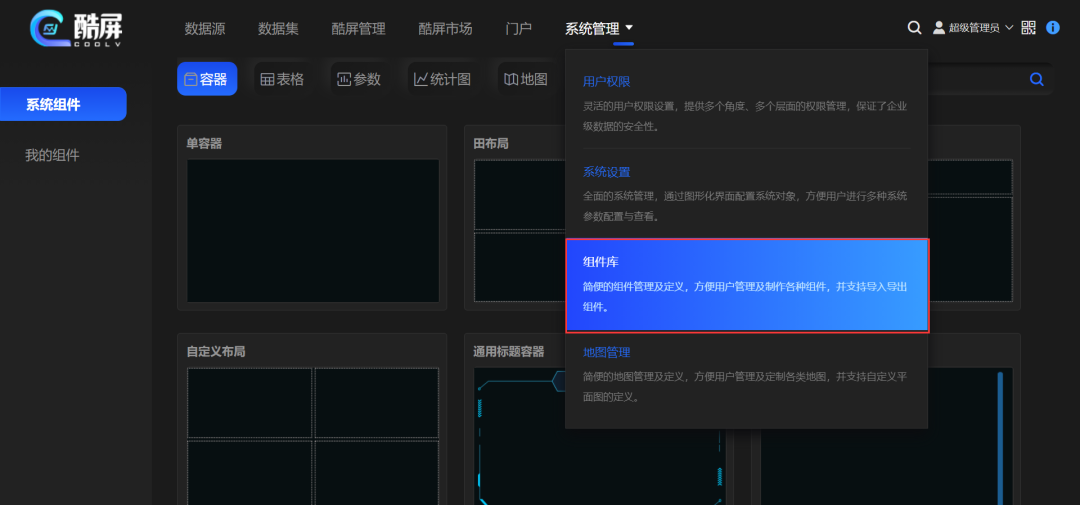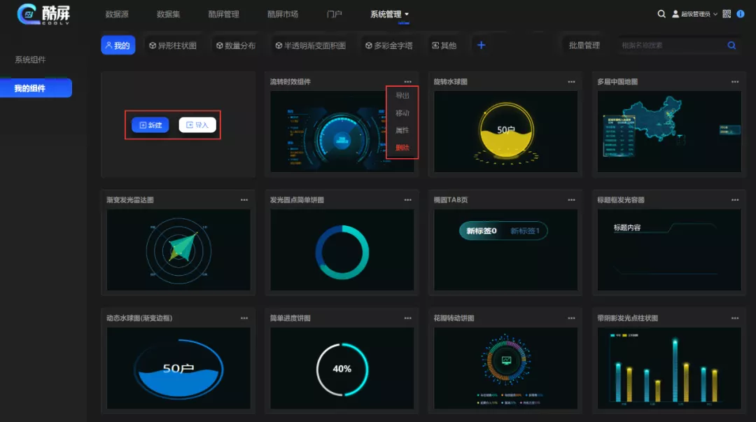 系统整体设计风格进行全面的更新,包括登录页、数据源、数据集、酷屏管理、酷屏市场、门户、系统管理等模块。从原来的蓝白商务风转成了黑色炫酷风,从视觉角度上提升科技质感,产品体验上让用户更专注于内容。