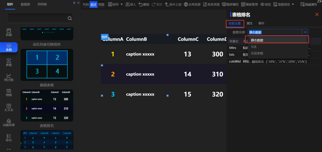 【操作说明】查看组件属性,点击“取数设置”,切换数据来源为“静态数据”。