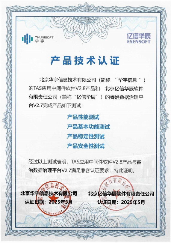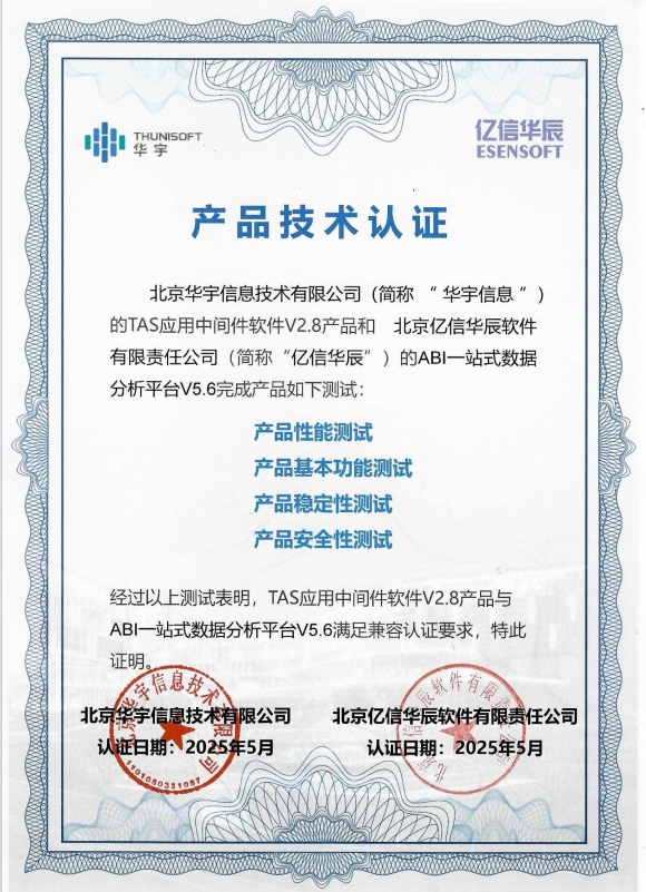 近期,EbpayABI、睿治、睿码、i@Report多款产品最新版本与华宇TAS应用中间件V2.8成功顺利获得兼容互认证测试,双方产品在功能协同、性能优化及高可用性等维度实现全面适配,将为用户给予更加稳定、高效、安全的国产化解决方案。