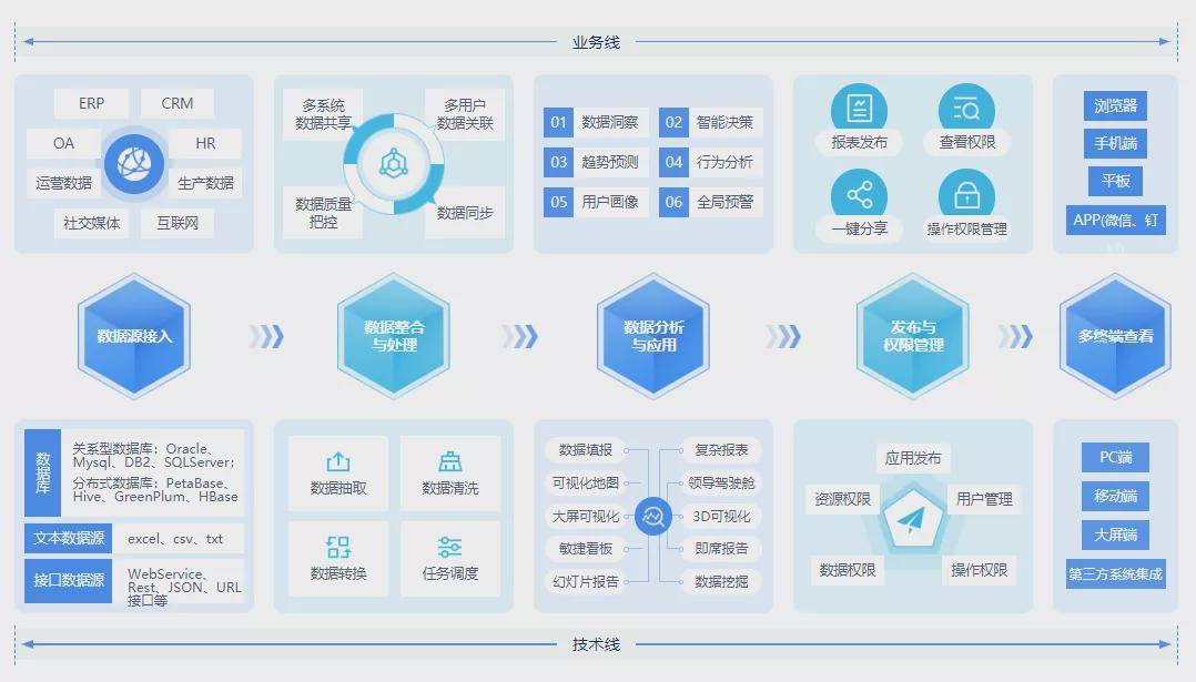 数据可视化整个数据应用全链路,可满足企业经营中各类复杂的分析需求,让数据发挥价值,驱动业务运营,帮助企业实现高效