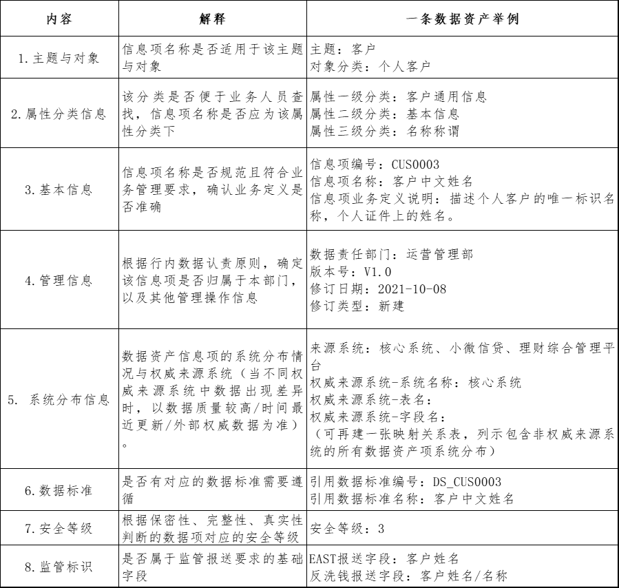 以银行一个“客户中文姓名”的基础数据项为例,顺利获得数据资产盘点,我们可以得到关于数据资产的以下方面信息: