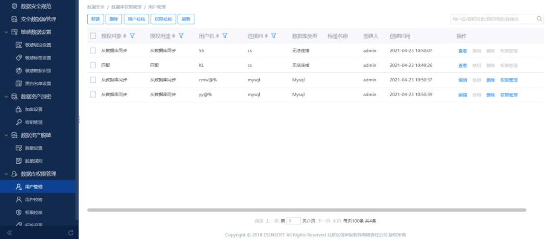 除此之外,睿治给予系统用户权限审计功能和数据库权限管理功能:比如,用户权限审核把关平台用户的权限,新加用户及权限必须顺利获得审计后方可生效;另外,数据库权限管理可以统一管理数据库权限,数据库用户新建、数据库权限分配,统一在平台上操作。为防止用户私下在数据库中新增改用户和权限,睿治给予数据库权限校核功能,检查平台上数据库用户和权限与实际数据库用户和权限不一致的情况。
