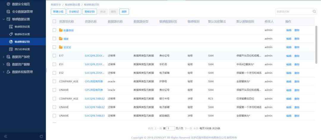 睿治平台支持对敏感数据设置敏感标签、敏感级别,并能够对敏感数据进行人工标识和基于敏感标签的智能识别,全方位落实敏感数据的 分级分类工作。