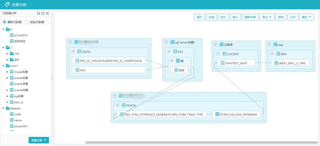 元数据管理平台给予了丰富的分析应用,包括:血缘分析、影响分析、全链分析、关联度分析、属性差异分析、元数据对比分析、重复元数据分析、元数据对比分析、重复元数据分析、同时支持将分析结果进行导出和收藏保存。