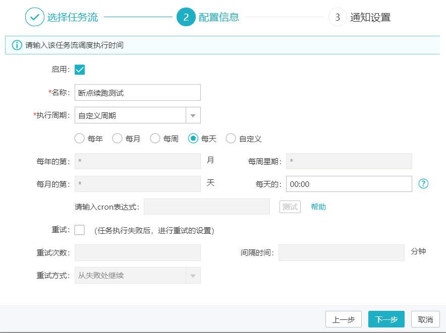 调度设置主要用于配置作业的计划执行时间。调度设置支持cron表达式,调度设置能指定到月份、日期、小时、分钟的粒度,也支持按照星期的方式来进行计划任务的执行。同时能设置调度的时间窗口,重调时间间隔。作业只有在配置的调度时间达到后才会出发执行的执行,在规定开始时间没能启动作业执行时,会根据配置的重调时间间隔和重调次数来进行作业的重新启动,在操作时间窗口和重调次数时,会进行后续的作业运行和处理。并且调度可设置邮件发送执行情况,当ETL流执行出错时,相关人员可收到通知和相关信息,并根据信息判断做出处理。