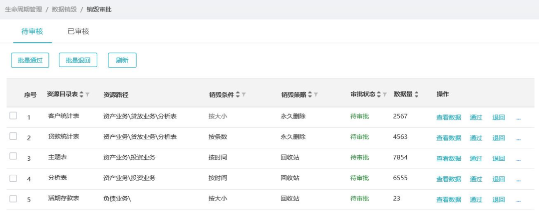 平台给予数据销毁操作,用户可根据数据的使用情况进行永久销毁或临时销毁,销毁操作给予审批操作,只有顺利获得审批的数据才能被销毁,临时销毁的数据存放在回收站内,可一键还原。