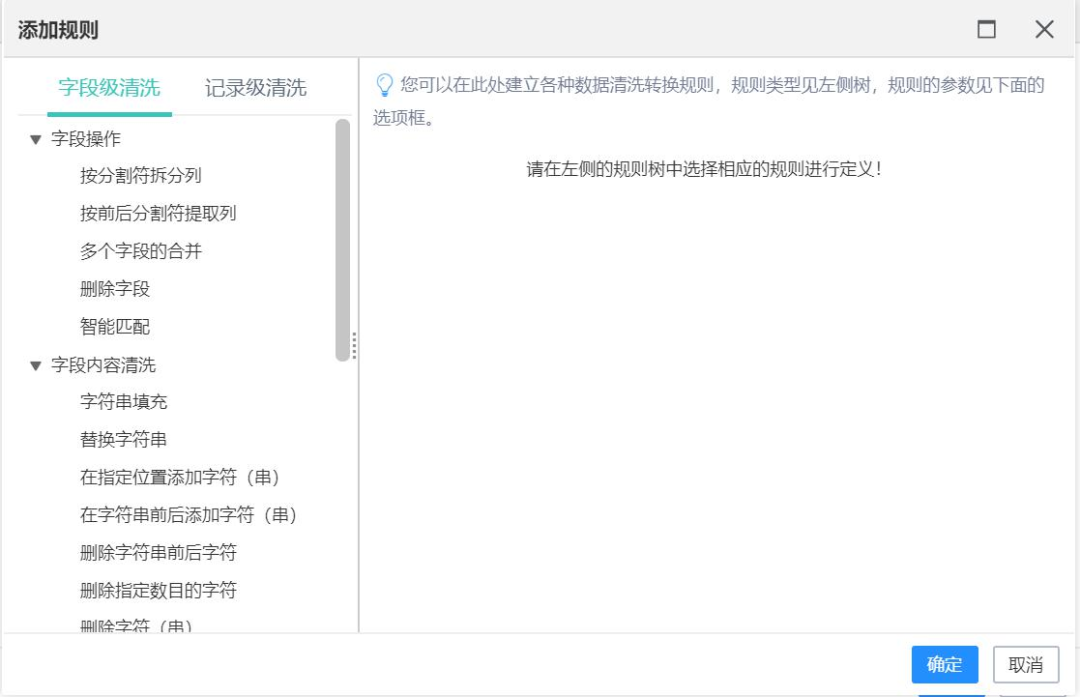 最后,数据整合封装了近30种清洗规则,用于完成数据的字段级和记录级清洗转换,省去了复杂的表达式定义,同时清洗组件支持边配置边预览清洗前的数据变化,支持多条规则的自动全关执行,节省性能开销。