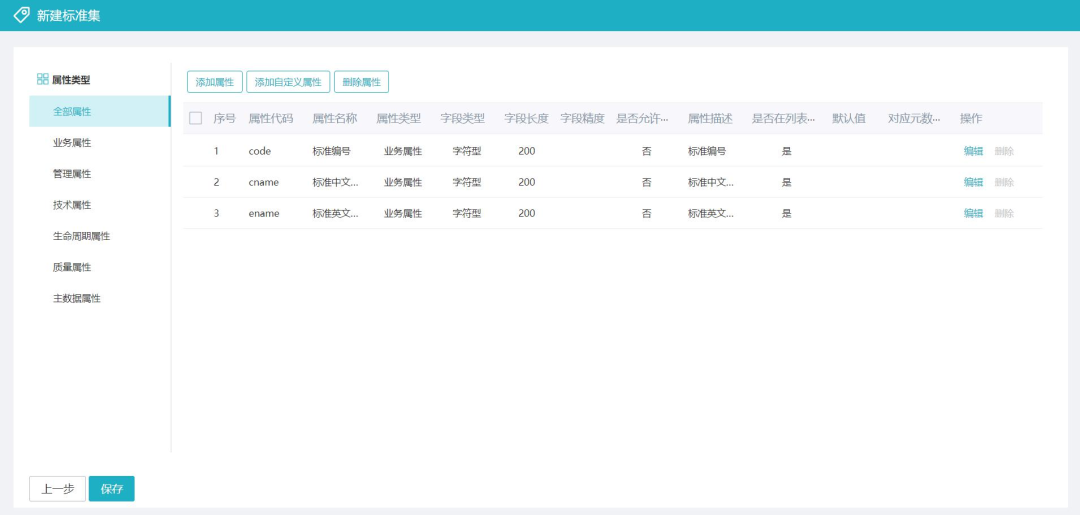 定义不同的数据标准可能存在需要录入不同的属性,为了满足不同项目对数据标准的设计,睿治数据治理平台给予了数据标准集管理,内置了业务属性、技术属性、管理属性、质量属性、主数据属性、生命周期属性等供用户选择使用,并支持自定义属性。
