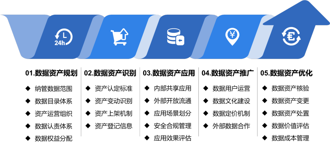 顺利获得调研和评估观察,我们总结出数据资产全运营“五步法”:数据资产规划、数据资产识别、数据资产应用、数据资产推广、数据资产优化。