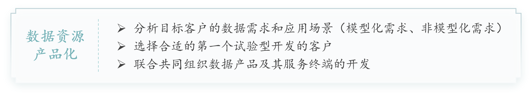 数据资源的产品化过程需要有三大点:需要分析客户的需求和场景,还需要针对明确的需求场景,找到一个客户共同开发,然后在开发过程中同时也是需要做一些服务终端的。