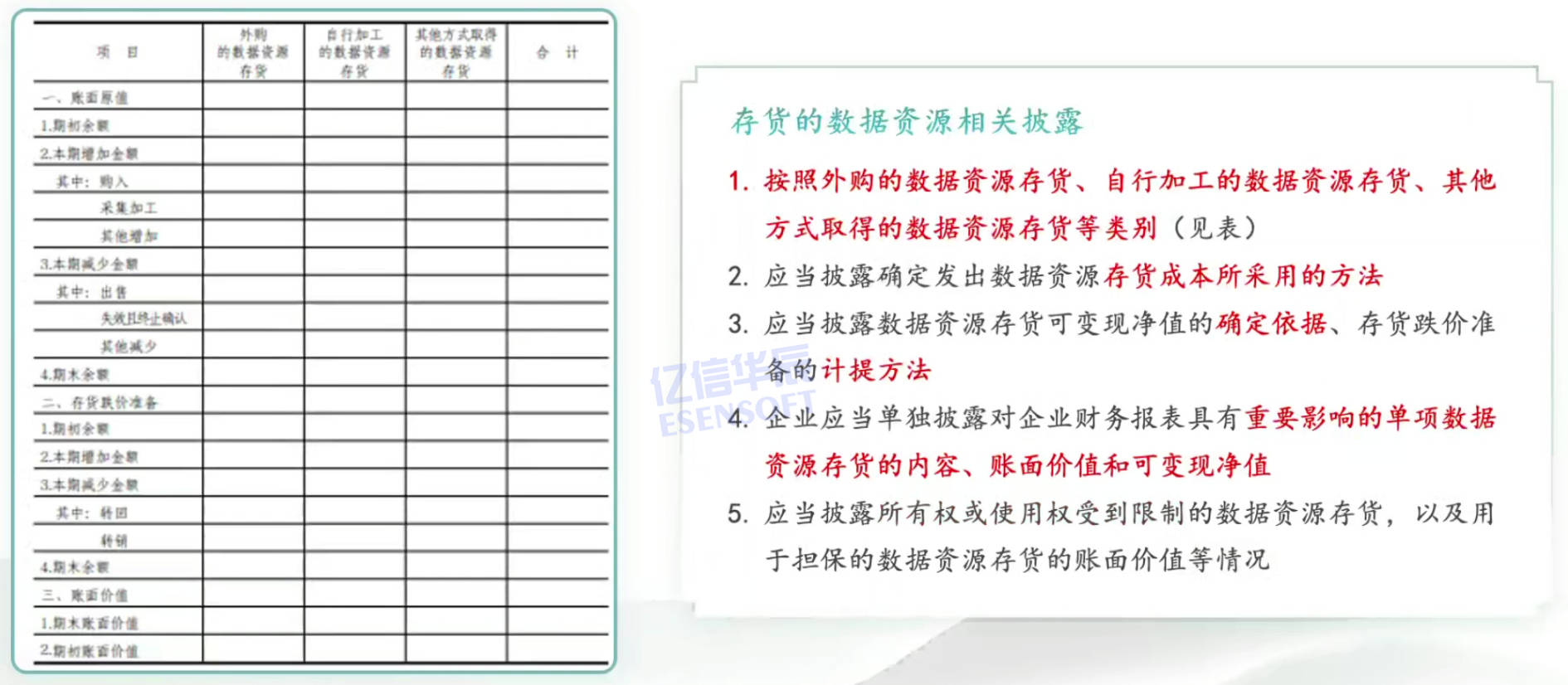 存货的数据资源相关披露需要按照外购的数据资产存货、自行加工的数据资源存货和其他方式取得的数据资源存货等类别进行披露,需要披露数据资源存货成本所采用的方法、计量方法、以及确定依据、计提方法、影响因素。