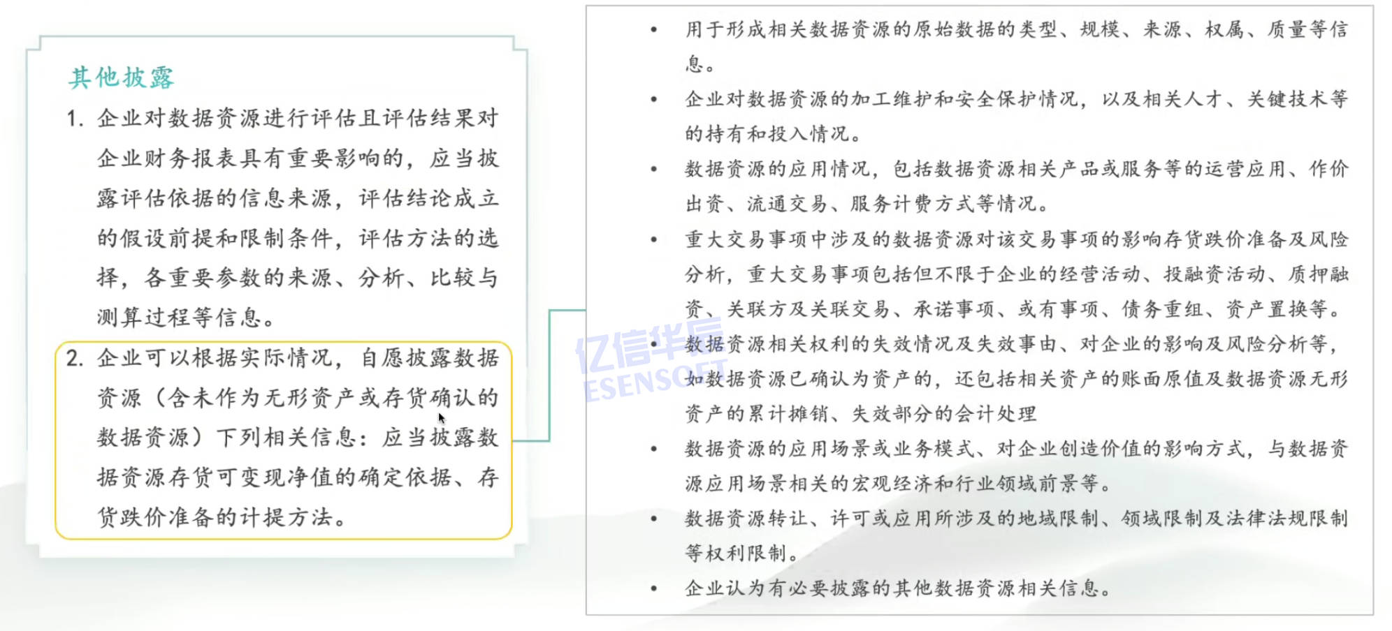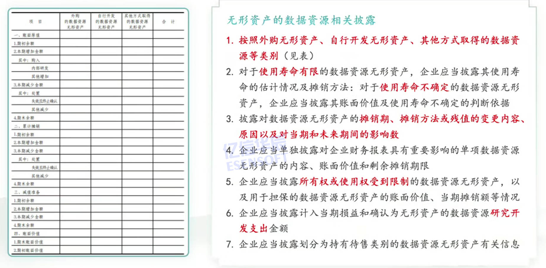 无形资产的数据资源相关披露是有一定要求的,比如说需要按照外购无形资产、自行开发无形资产和其他的方式无形资产这种类别进行一个披露,即需要向外界不仅展示会计上能够列为资产的东西,也需要展示像数据整个过程,包括无形资产使用寿命、摊销期、摊销方法、残值变更内容、原因以及未来影响因素、权益的限制、研发开发支出等,让外界分析整个过程,更透明化。