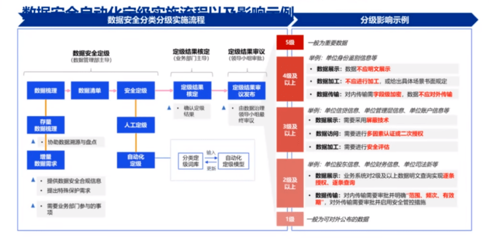 第三,在实行前两点以后,利用人工智能或者是规则库的方法建立自动化的定级模型,并对模型进行相应的调试和优化;利用人工智能切分词库建立自动化定级模型的方式适用于数据类型比较多、场景比较复杂、很难用具体的规则来去限定安全等级的企业;利用规则库的方法适用于行业给出明确建议的公司。但是我们的定级结果还是要求由数据主管方来确认的,也就是说业务部门要来确认数据定这个等级是否合适,最后要把定级结果进行发布。