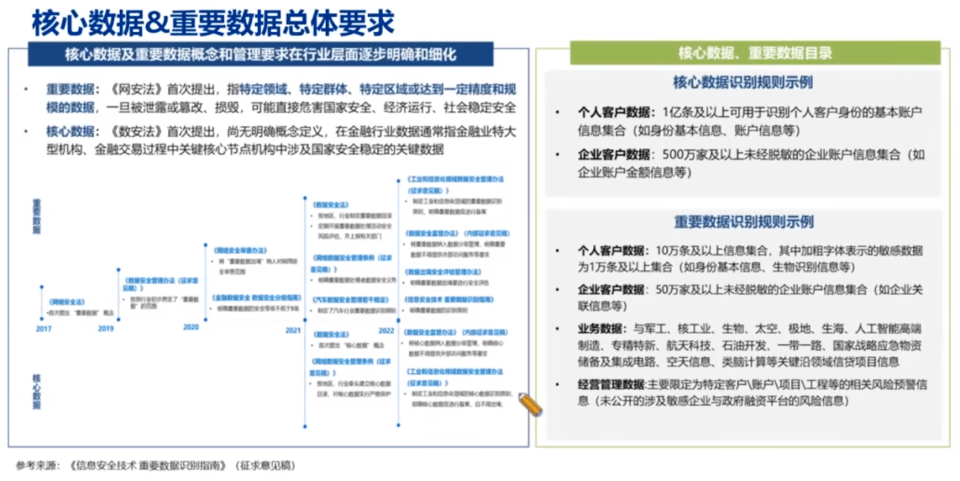 那讲完分类分级体系的三块落地的核心要点,基本上能够搞定企业内部比较基础的数据的分类定级,但是还有两类非常重要的数据,一个是核心数据,另外一个是重要数据。核心数据往往是国家层面,涉及到整个国家安全;重要数据往往跟特定的行业、特定的群体、特定的区域有关系。核心数据和重要数据分类分级的核心目标就两点:第一点,学会识别核心数据和重要数据;第二点,分析这些数据当前的使用情况,确保满足数据合规的要求。