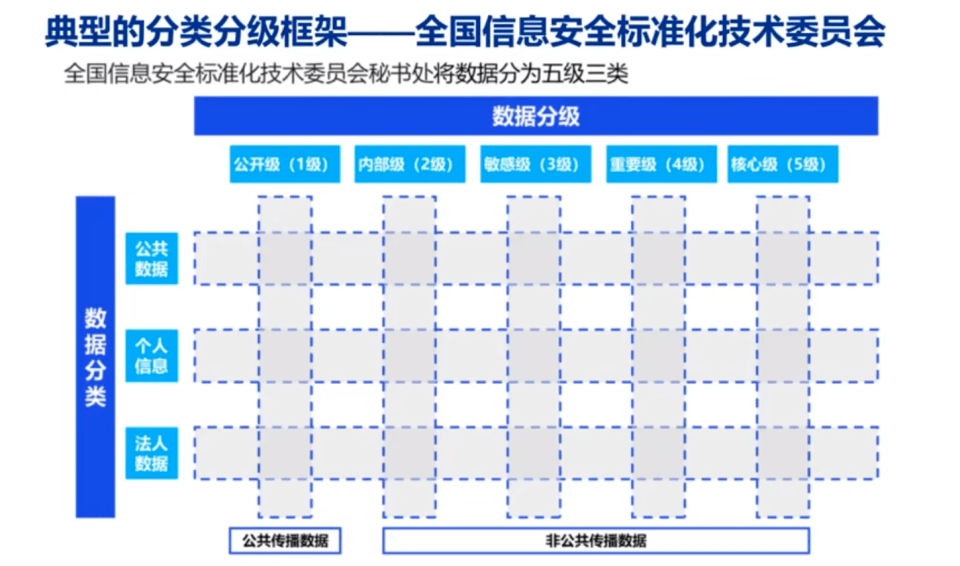 全国信息安全标准化技术委员会秘书处将数据分为五级三类,把国家的数据分为公共数据、个人数据和法人数据三级,在大的分类向下,把整个数据分级分为公开级、内部级、敏感级、重要级和核心级。