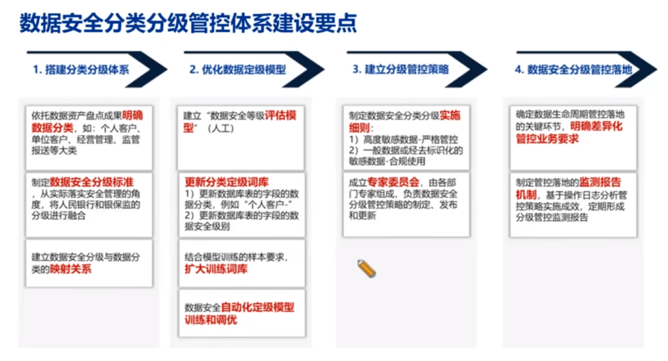 最后总结数据安全分类分级管理体系建设要点,包括1、搭建分类分级体系;2、依据搭建好的分类分级体系,构建和优化定级模型,自动化训练定级结果;3、依据定级结果,建立企业自身的分级管控策略;4、管控策略落地,形成检测报告、风险预警。