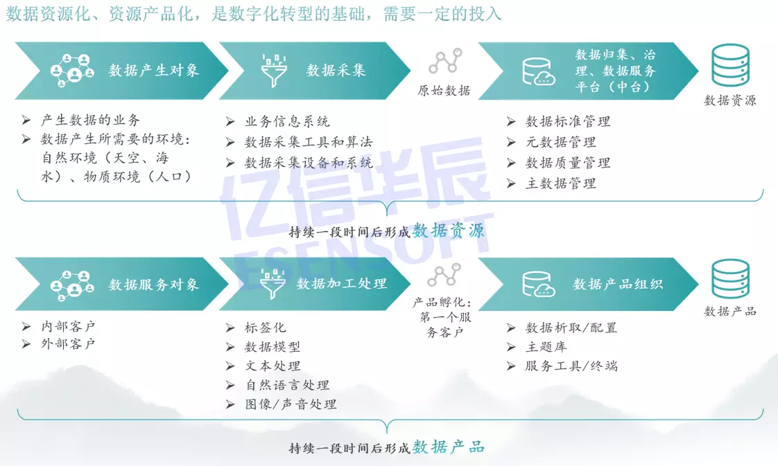 第一步是数据资源化,企业将公共数据、系统生成数据和市场采购数据进行加工整合,形成资源,这一过程属于资源化的过程。