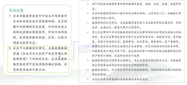 无形资产的数据资源相关披露是有一定要求的,比如说需要按照外购无形资产、自行开发无形资产和其他的方式无形资产这种类别进行一个披露,即需要向外界不仅展示会计上能够列为资产的东西,也需要展示像数据整个过程,包括无形资产使用寿命、摊销期、摊销方法、残值变更内容、原因以及未来影响因素、权益的限制、研发开发支出等,让外界分析整个过程,更透明化。
