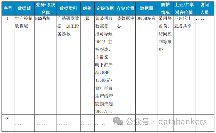 工作人员梳理、整合所有数据条目的类型,携手数据来源、使用及责任部门,顺利获得归并整合、细分子类等方式,形成企业工业数据清单。在完成数据分类的基础上,工作人员将按照数据域的顺序依次约谈各类数据涉及的管理部门相关人员,并发放调查问卷,确定各类数据的级别并标明原因。企业部分数据定级结果如表6所示。