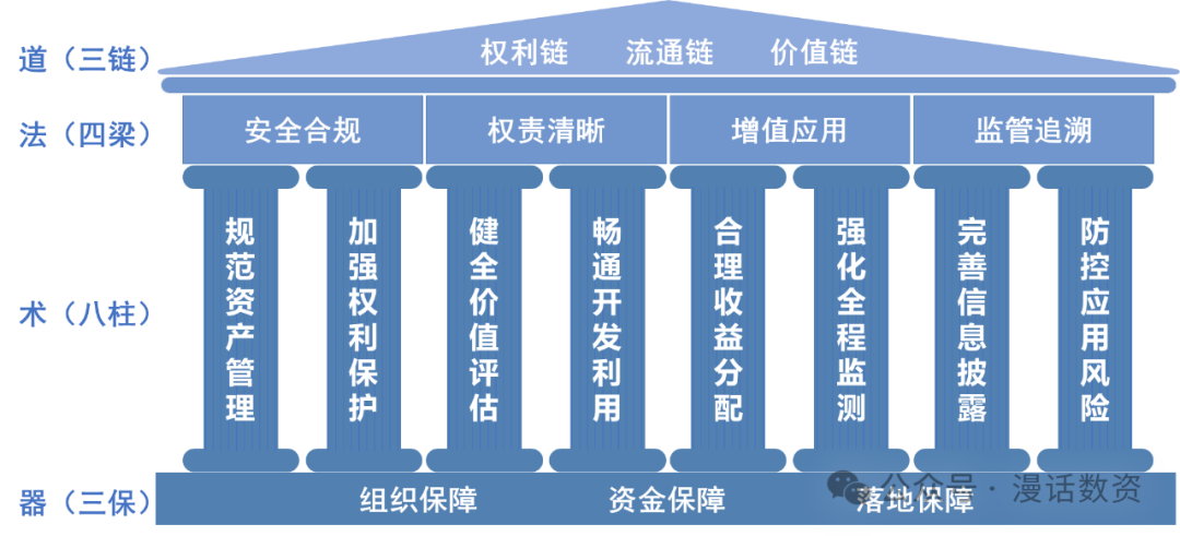 道,即规律和本质,表现为三链,是指权利链,流通链,价值链;法,即原则和方向,表现为四梁,是指安全合规,权责清晰,增值应用,监管追溯;术,即策略和路径,表现为八柱,是指规范资产管理,加强权利保护,健全价值评估,畅通开发利用,合理收益分配,强化全程监管,完善信息披露,防控应用风险;器,即工具和保障,表现为三保,是指组织保障,资金保障,落地保障。