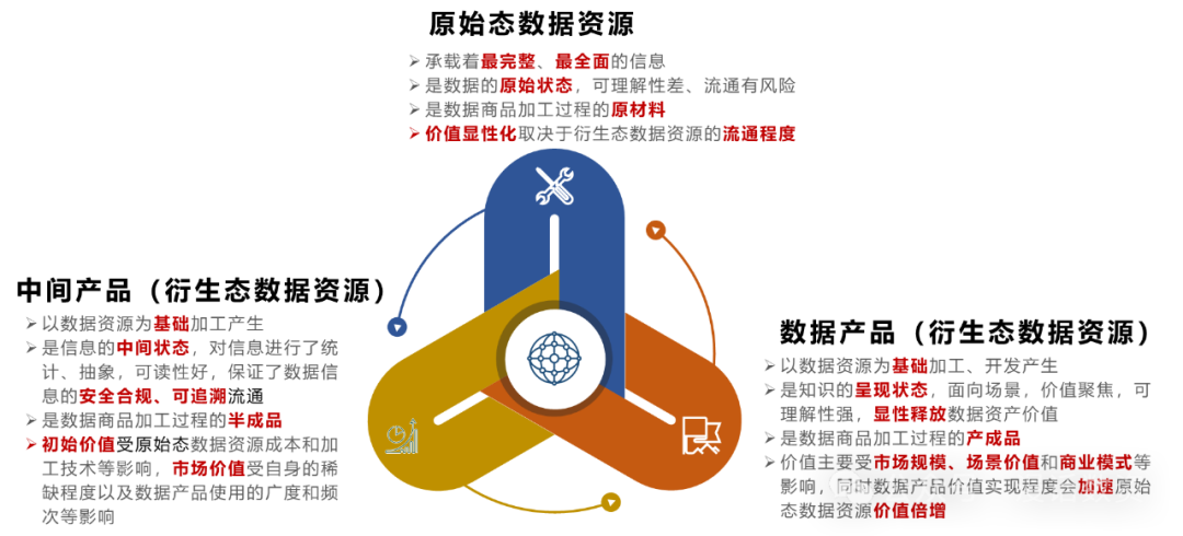 这三条链也是助力数据要素市场价值流通的核心主线,解决权属界定不清晰、流通风险不可控、价值度量不统一等核心痛点问题。数据资产管理赋予了数据资源的资产属性,并基于此衍生了原始态数据资源的产权交易(金融价值)和衍生态数据资源的商品交易(场景价值),进而有助于数据要素市场合规化、标准化、规模化的价值流通。数据资产管理是数据要素价值流通的稳定器和压舱石,数据要素价值流通是数据资产价值蝶变的加速器和催化剂,二者相辅相成、相互促进。