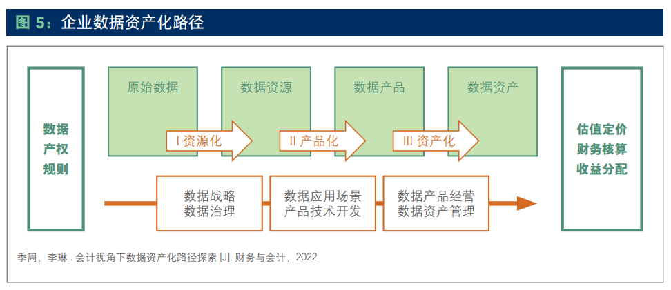 本报告提出企业数据资产化路径的研究框架,分为数据资源化、数据产品化、数据资产化三个阶段数据资源化指数据经过搜集、清洗、标注、脱敏等加工过程,原始数据变为可产生使用价值或可实现经济利益的数据资源的过程。资源化标志是组织顺利获得数据战略构建数据资源全景图,提升数据规模和质量,实现业务数据化。数据产品化指以价值发现为目标,根据特定的业务需求和场景,顺利获得用户、业务或流程逻辑进行数据治理,最终形成数据产品或服务的过程。自用型和交易型数据产品是根据数据应用需求和场景不同发挥数据产品的内外部价值。数据资产化是指数据产品顺利获得流通交易给使用者或所有者带来经济利益,符合企业会计准则“资产”的定义和确认条件,进而在会计系统中“确认和计量”的过程。