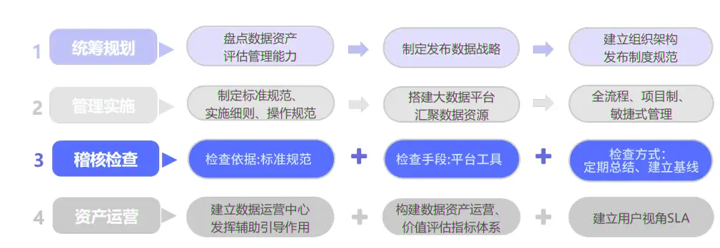 数据资产管理包含数据资源化、数据资产化两个过程。业内关于数据资产管理实践的通用步骤,包括“统筹规划→管理实施→稽核检查→资产运营”,各步骤之间并无严格的先后顺序,组织可结合自身情况在各阶段制定合理的实施方案。