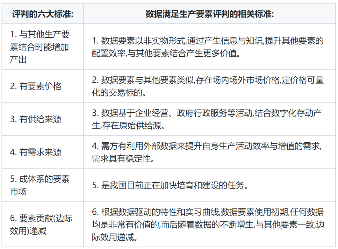 为什么数据能作为生产要素,下表是生产要素的评判6大标准,可以看到数据在我国成为生产要素的条件逐步成熟。