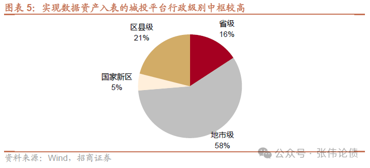 实现数据资产入表的城投平台以省级和地市级为主,行政级别中枢较高。具体来看,19家城投平台中,省级平台、地市级平台、国家新区平台和区县级平台分别为3家、11家、1家和4家,占比分别为16%、58%、5%和21%。地市级及省级平台数量占比达到74%,说明现阶段数据资产入表工作优先在较高层级的城投平台进行试点。
