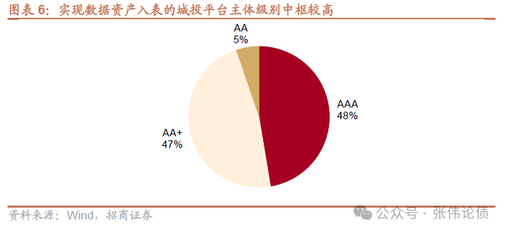 数据资产入表城投平台基本拥有AA+或更高主体评级。19家城投平台中,AAA、AA+和AA主体分别为9家、9家和1家,AA主体占比仅5%。这同样说明现阶段数据资产入表主要集中在优质城投平台。