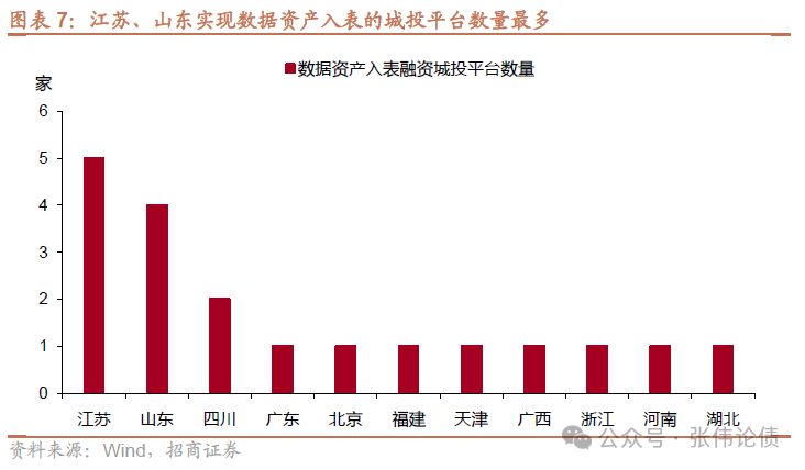 数据资产入表城投主要集中在江苏、山东。从区域分布来看,19家数据资产入表城投平台分布在全国11个省级行政区。江苏、山东的平台数量最多,分别达到5家、4家。此外,四川有2家平台实现数据资产入表,广东、北京、福建、天津、广西、浙江、河南和湖北等地区各有1家平台。