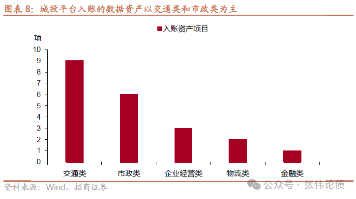 城投入表的数据资产以交通类和市政类为主,符合城投平台基本业务属性。我们按照数据资产情况,将城投平台入表的数据资产分成了交通类、市政类、企业经营类、物流类和金融类等五个类别。据统计,19家城投平台共入账21项数据资产,其中,交通类资产入账最多,达到9项,典型项目如城市路网车流量数据、停车场数据资源等。市政类资产入账6项,典型项目如供热管网数据集、社会治理和惠民服务数据集等。企业经营类、物流类和金融类数据分别入账3项、2项和1项。整体来看,城投平台主要业务集中在城市基础设施投融资、市政基础设施运营等方面,与本次入账资产的项目类型相对匹配。