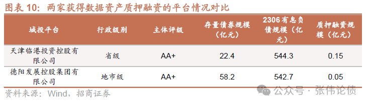 现在,天津市的天津临港投资控股有限公司和四川省德阳市的德阳开展控股集团有限公司均已实现数据资产质押融资,融资规模分别为1500万元和500万元。两家平台均具有AA+主体评级,但天津临港投控为省级平台,德阳发投集团则为地市级平台。23年6月末两家平台的有息负债规模分别为544.3亿元和542.7亿元,质押数据资产取得的信贷规模占有息负债的比例相对较低。