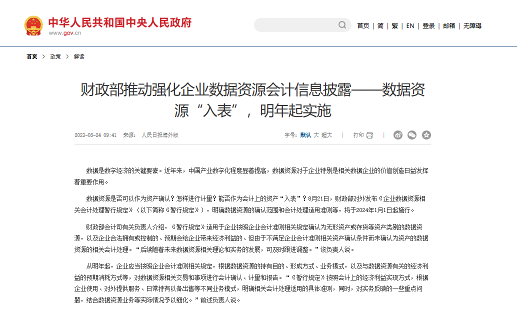 财政部于2023年8月21日印发了《企业数据资源相关会计处理暂行规定》(以下简称《暂行规定》),为数据资源的资产化给予了具体的操作指南,该规定自2024年1月1日起施行,标志着数据资源正式被纳入企业资产负债表。
