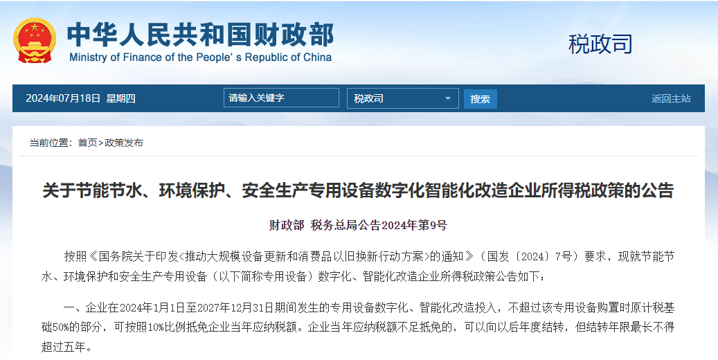按照《国务院关于印发<有助于大规模设备更新和消费品以旧换新行动方案>的通知》(国发〔2024〕7号)要求,现就节能节水、环境保护和安全生产专用设备(以下简称专用设备)数字化、智能化改造企业所得税政策公告如下: