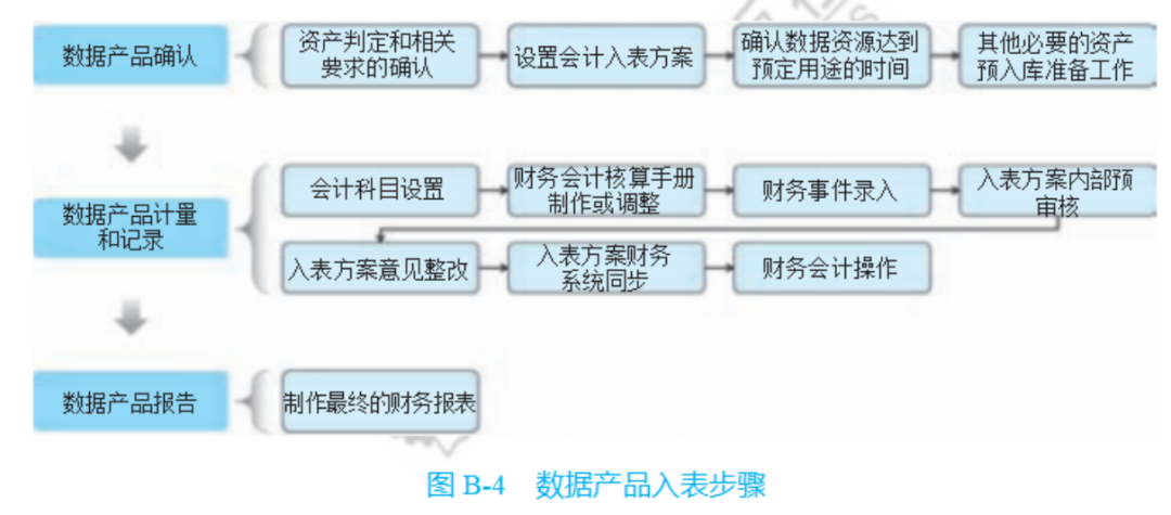 基本步骤,分为数据产品确认、数据产品计量和记录、数据产品报告三个 阶段。每个阶段还包含不同的细分步骤,具体步骤见图 B-4。详情参见《一本书讲透数据资产入表》第 9 章。