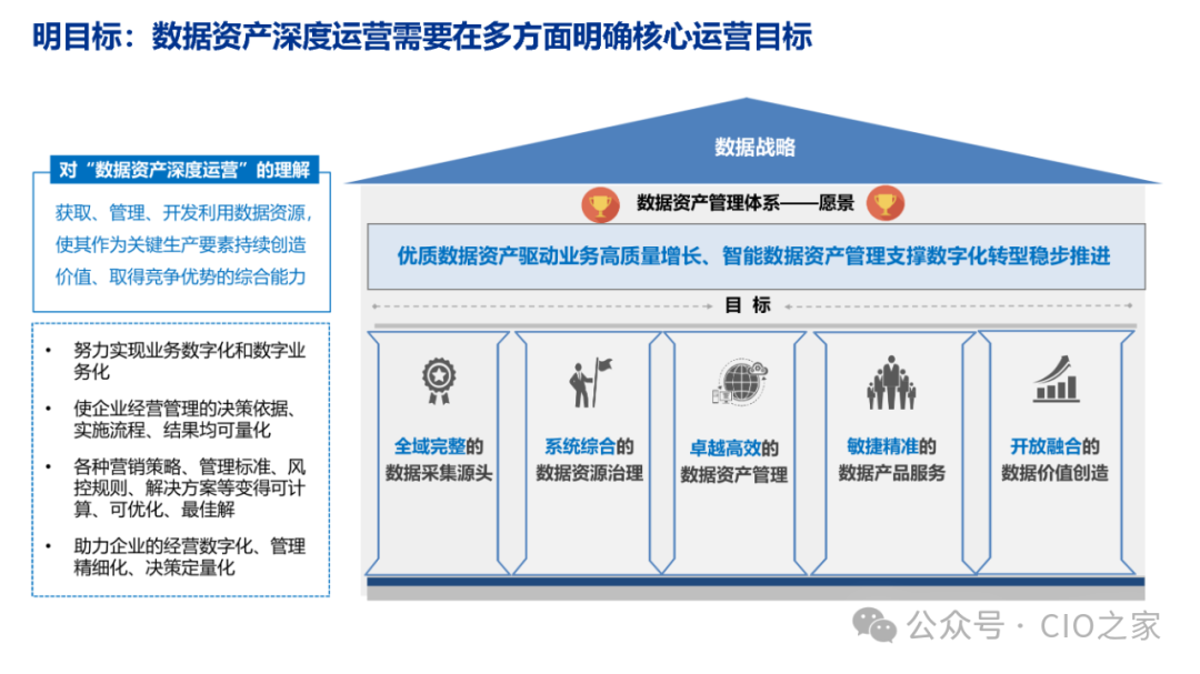 明目标:让数据驱动精细化运营数据资产深度运营的核心目标是实现企业的经营数字化、管理精细化和决策定量化 。这意味着,企业的决策依据、实施流程和结果都将变得可量化、可优化,各种营销策略、管理标准和风控规则也将实现最佳解。