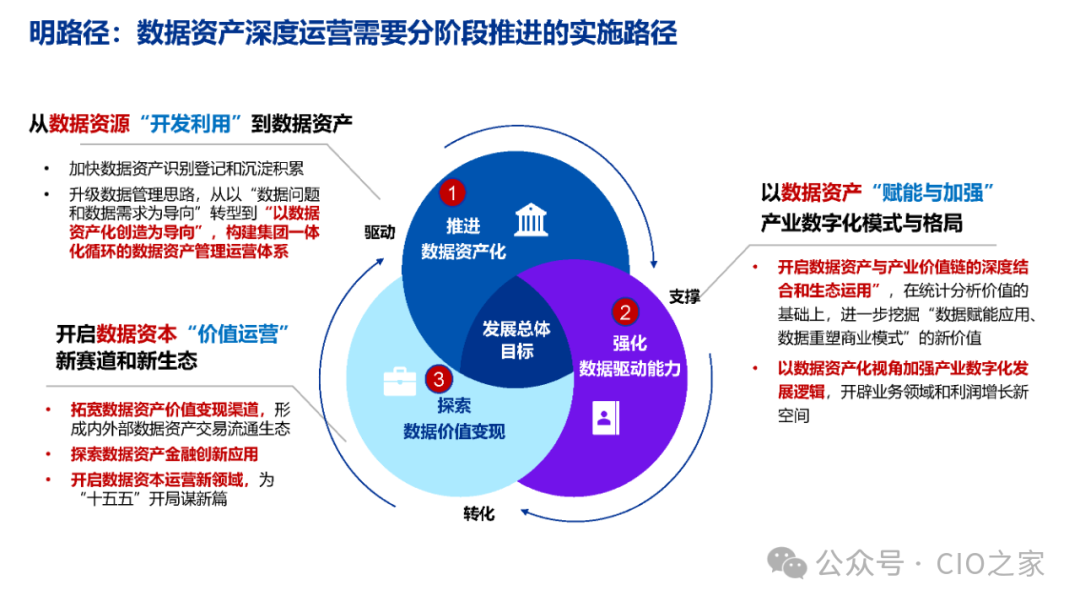 明路径:分阶段释放数据价值数据资产的价值释放需要一个循序渐进的过程。我们需要经历从数据资源的“开发利用”到数据资产化,再到探索数据资本“价值运营”新赛道和新生态,最终以数据资产“赋能与加强”产业数字化模式与格局这几个阶段 。每一步都至关重要,为企业打开新的增长空间。