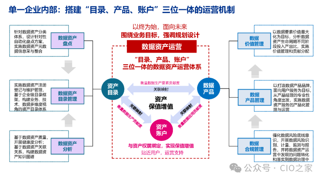 单一企业内部:搭建“目录、产品、账户”三位一体的运营机制,实现数据资产的盘点、分析、目录管理、产品管理、价值管理和合规管理 。